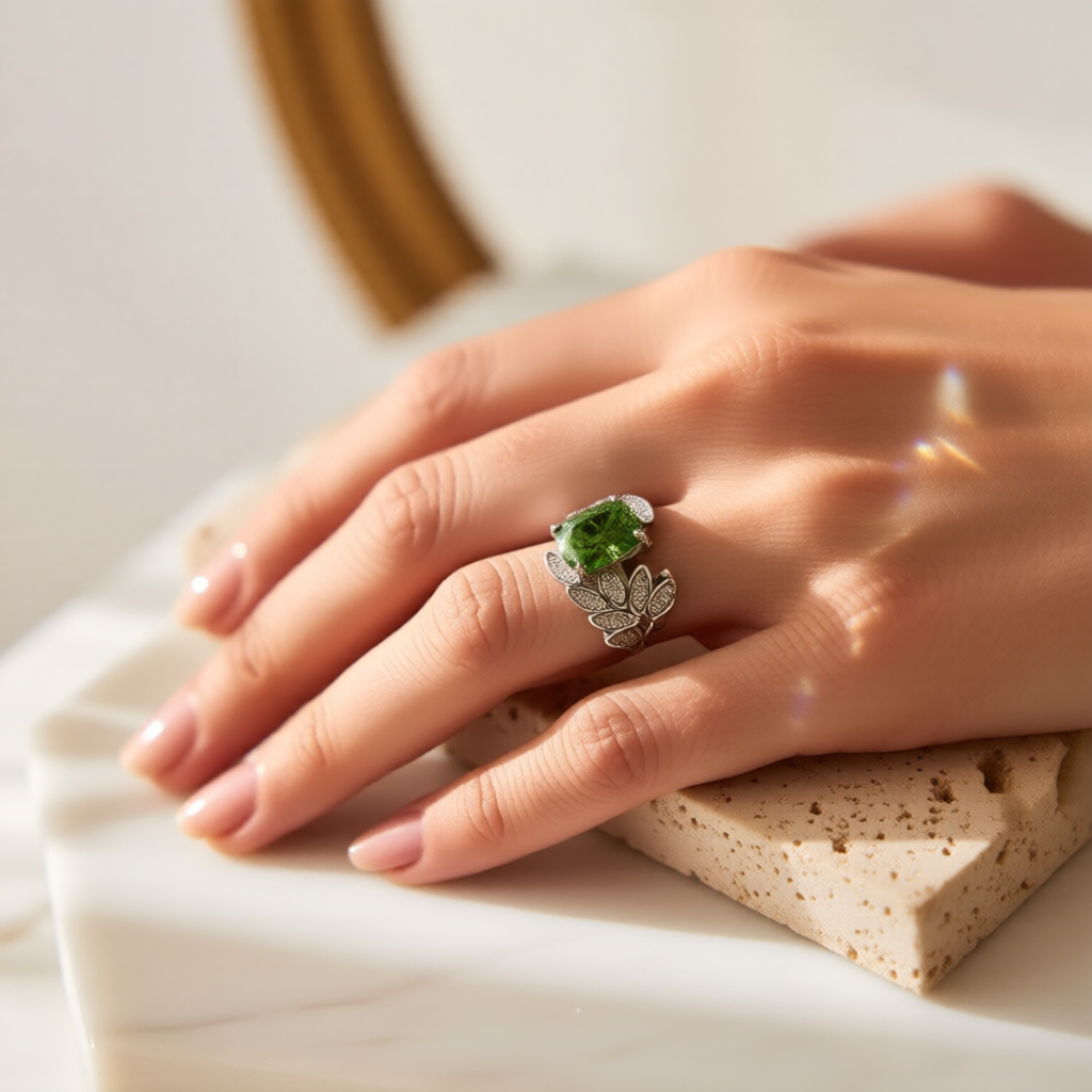 Inspired by Nature, Redefining Fingertip Aesthetics. This piece features a select cushion-cut green gemstone, paired with a leaf-like geometric pavé setting that perfectly blends forest rhythms with the cool elegance of S925 silver. It is more than an accessory—it is an elegant extension of your personal taste.