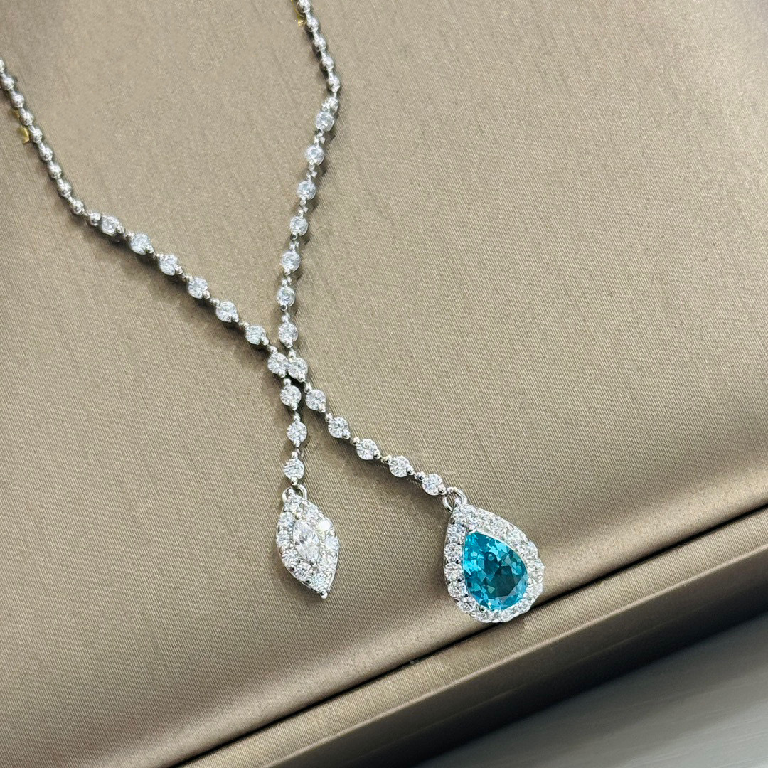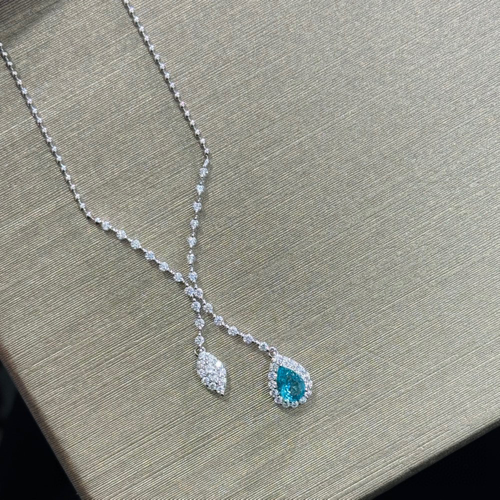 Design:Featuring high-brilliance aquamarine-toned gemstones with professional geometric teardrop halo setting artistry.This "Mermaid Tear" tassel design enhances depth and light refraction, reflecting a confident and elegant style with every movement.