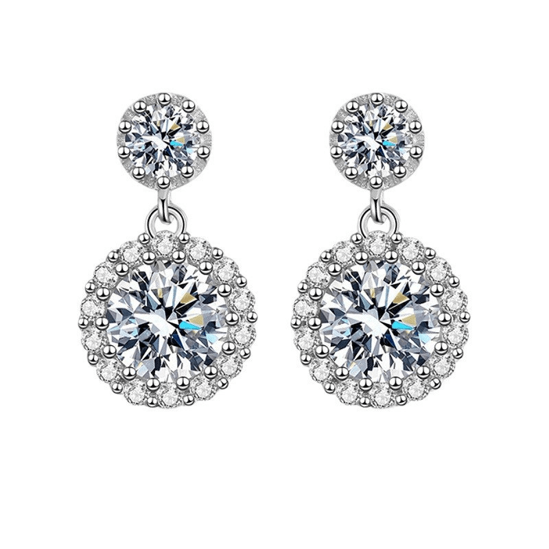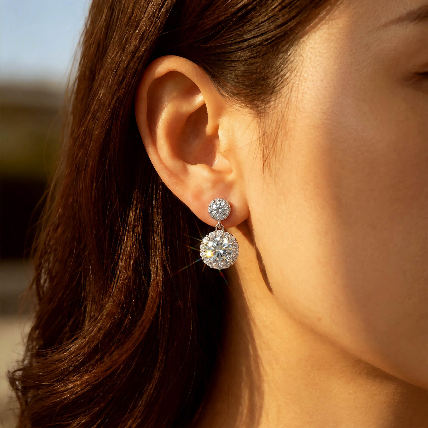 Design:Featuring top-tier Moissanite at the center with professional dual geometric halo setting artistry, accented by a delicate round stone above.This tiered drop design enhances depth and fluid movement, reflecting a confident and elegant style with every step.