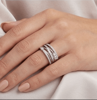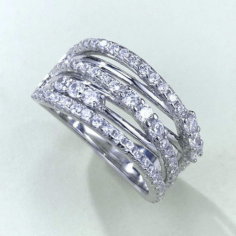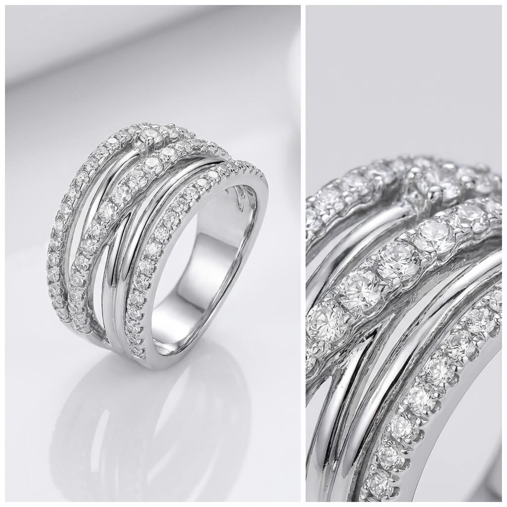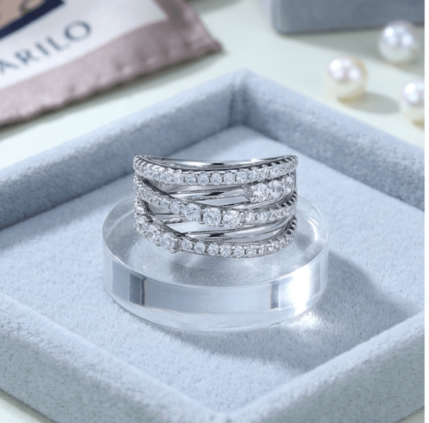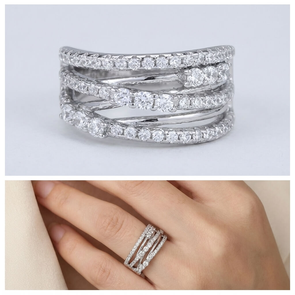 Design:Featuring top-tier high-brilliance stones with professional geometric multi-layered intertwined setting artistry.This wide multi-layer full-diamond design enhances visual impact and light refraction, reflecting a confident and elegant style.