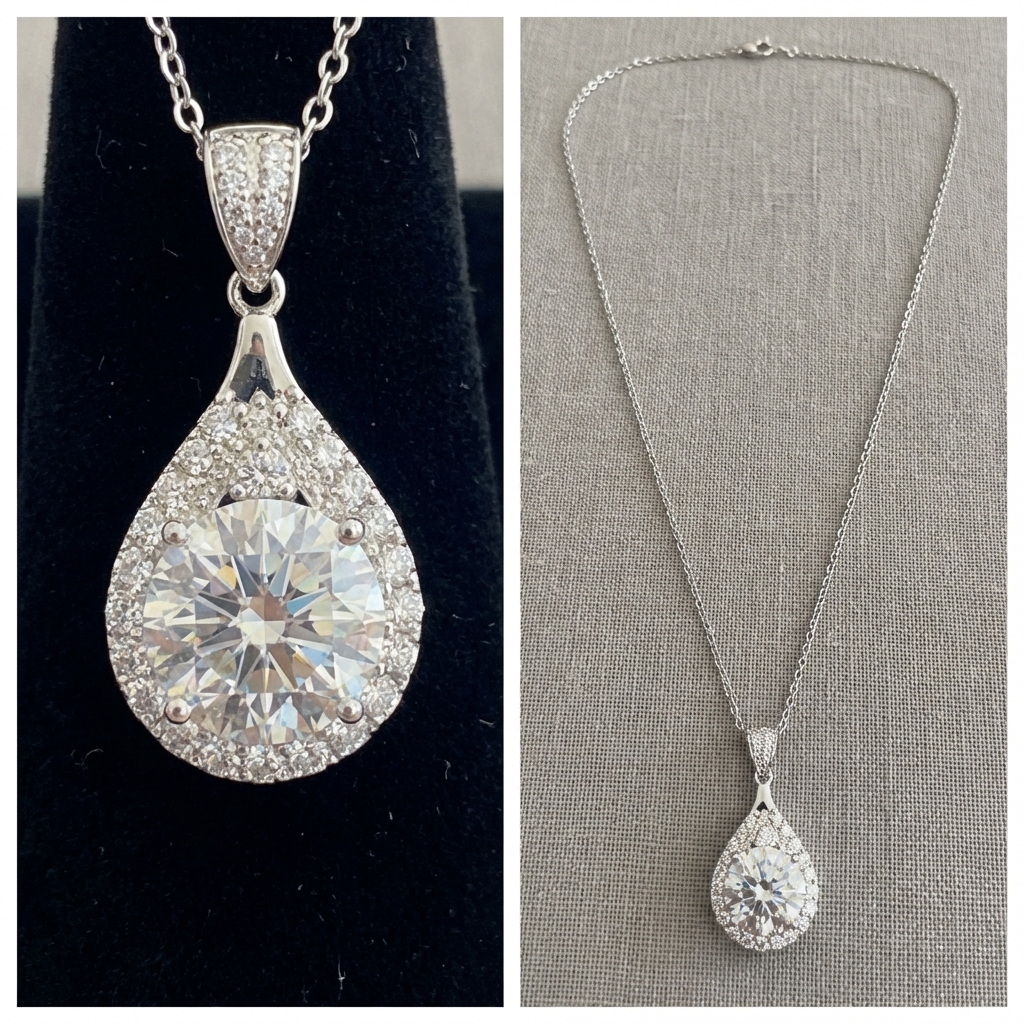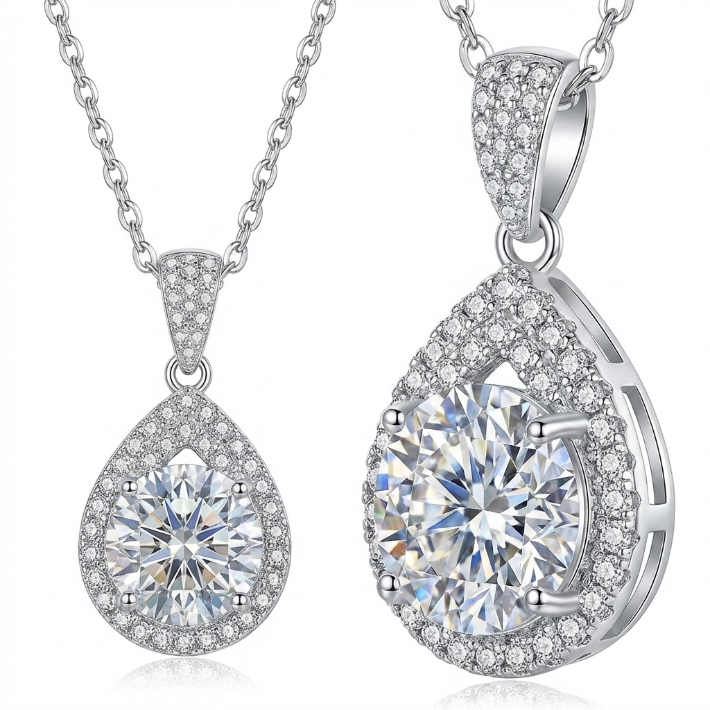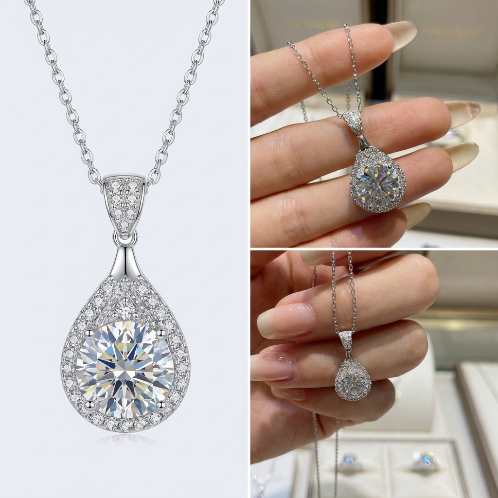Design:Featuring top-tier high-brilliance 3-carat Moissanite with professional geometric pear-shape (teardrop) halo setting artistry, surrounded by pavé stones.This visual structure significantly enhances the magnification effect and light refraction, reflecting a confident and elegant style.
