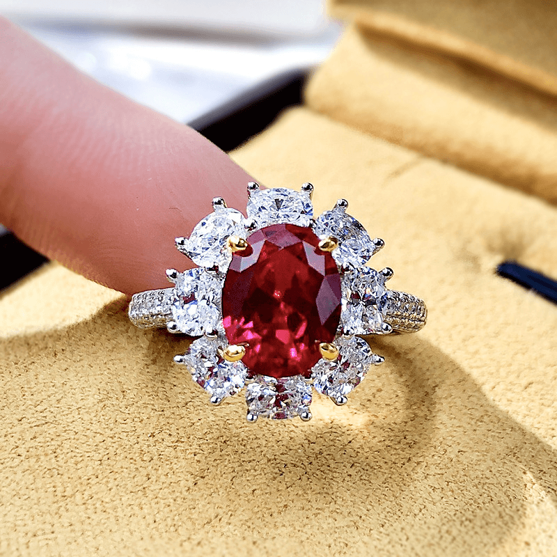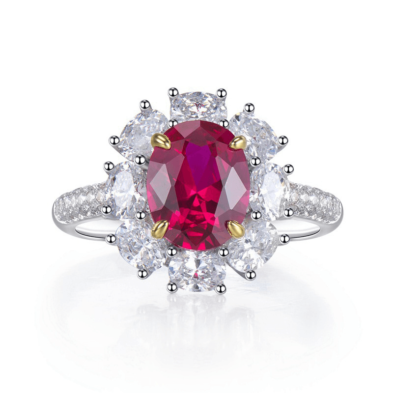 Design:Featuring high-brilliance 7*9mm oval simulated sapphire or ruby at the center, surrounded by a creative geometric halo of sparkling oval zircons.This design enhances depth and visual impact, reflecting a confident and elegant style.