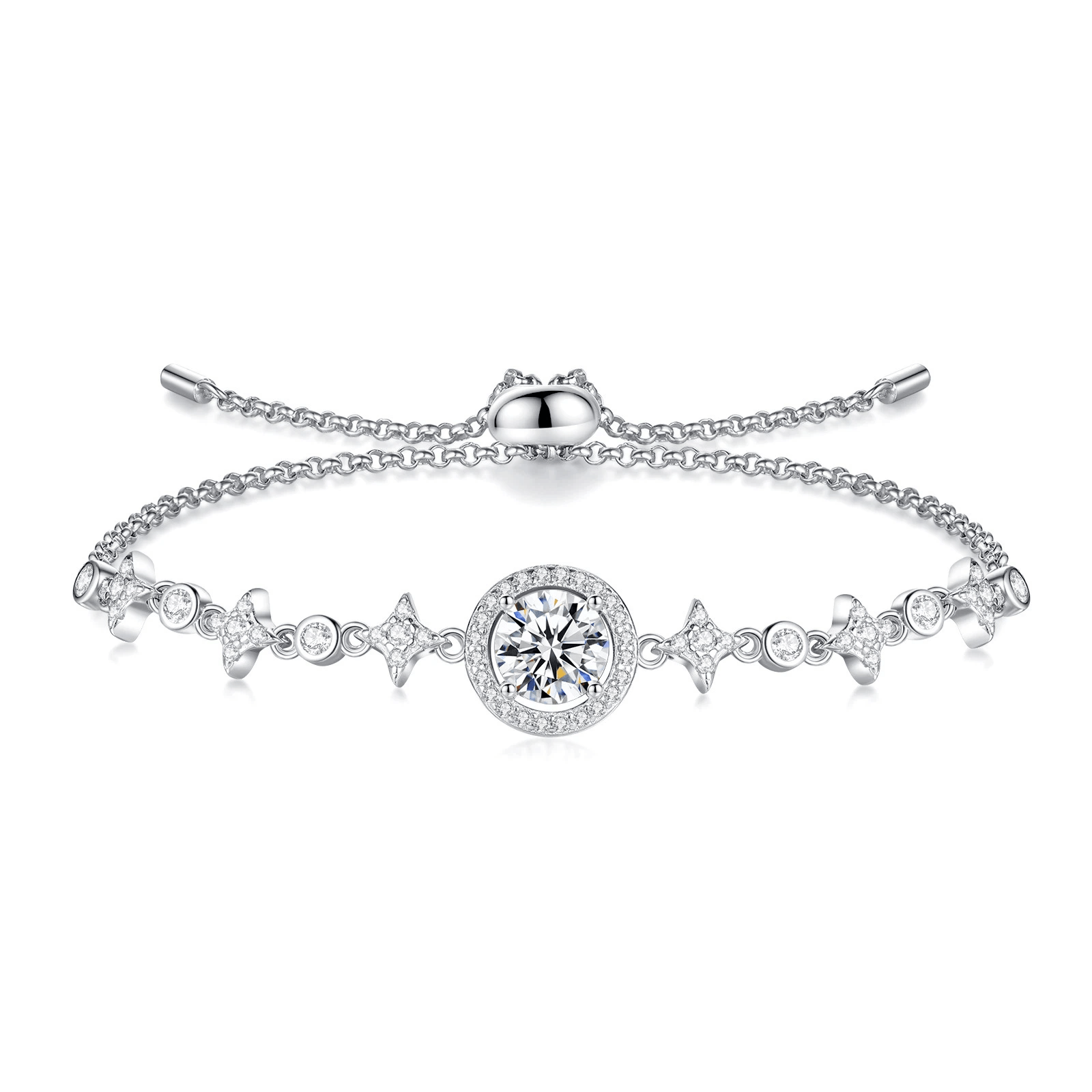 Design:Featuring a high-brilliance 1-carat Moissanite at the center with a professional circular halo setting, accented by starry pavé diamonds and delicate geometric star elements.This natural design enhances depth and dreamlike beauty, reflecting a confident and elegant style.